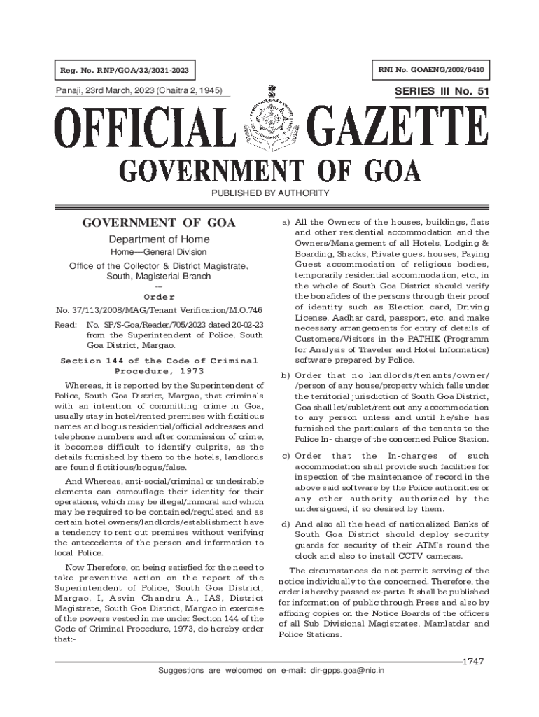 RNA No. GOING/2002/6410Reg. No. RNA/GOA/32/20212023Panaji, 23rd March 2023 (Chair 2, 1945)SERIES III No. 51PUBLISHED BY AUTHORITYGOVERNMENT OF GOA Department of Home HomeGeneral Division Office of