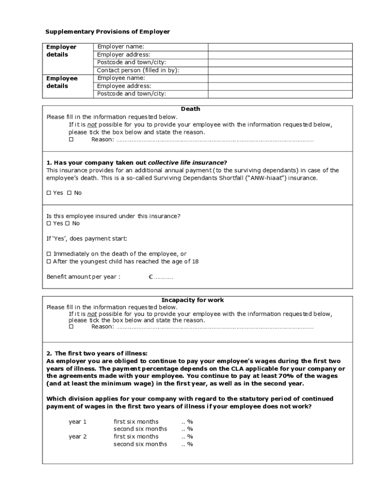 Supplementary Provisions of Employer detailsEmployee detailsEmployer name: Employer address: Postcode and town/city: Contact person (filled in by): Employee name: Employee address: Postcode and town/city:Death