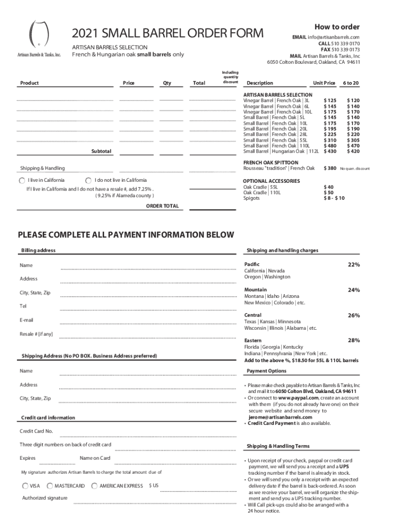 2021 SMALL BARREL ORDER FORM ARTISAN BARRELS SELECTION French & Hungarian oak small barrels onlyProductPriceQtyTotalIncluding quantity discountSubtotal Shipping & Handling I do not live in California