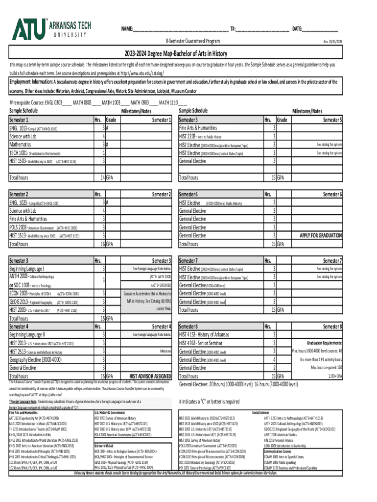 NAME:___ T#:___ DATE:___ 8Semester Guaranteed Program Rev. 03/26/202320232024 Degree Bachelor of Arts in History This map is a terabytes sample course schedule. The milestones listed to the right