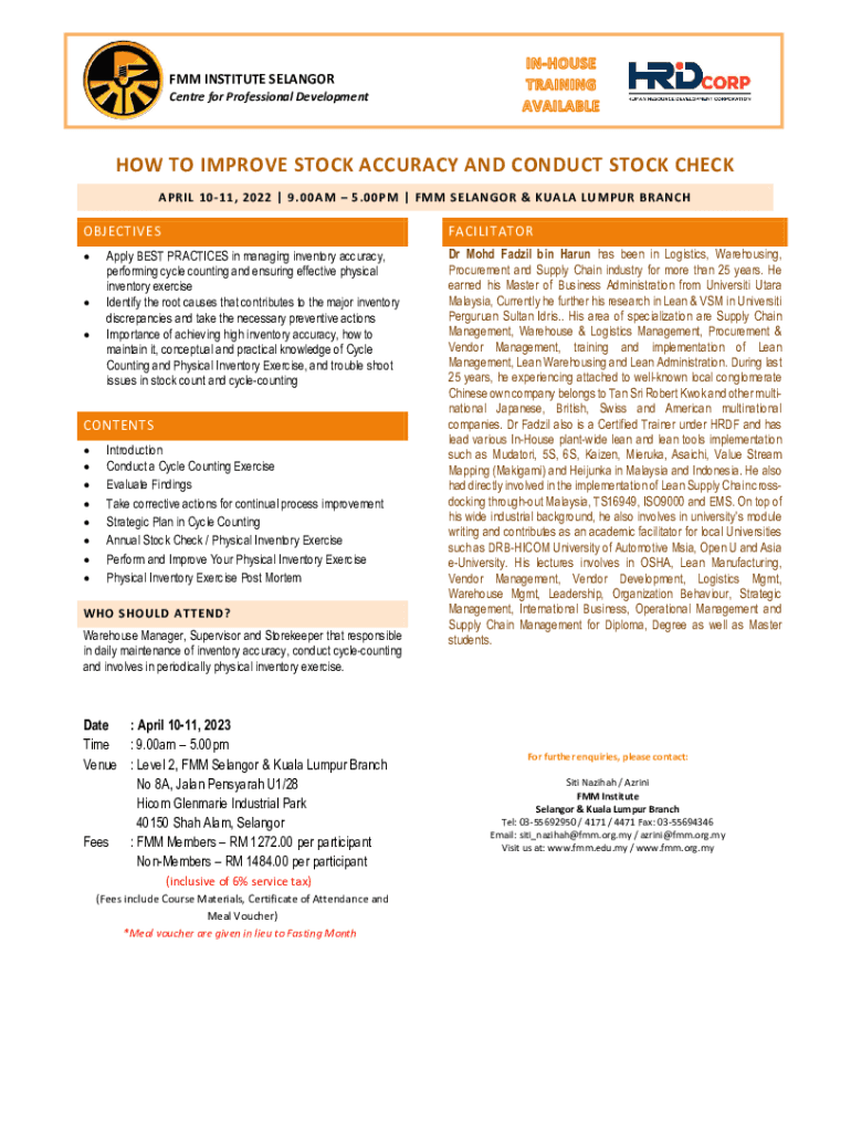 FMM INSTITUTE SELANGOR Center for Professional Development TO IMPROVE STOCK ACCURACY AND CONDUCT STOCK CHECK APRIL 1011, 20 22 | 9.00 AM 5.00PM | FMM SELANGOR & KUALA LUMPUR BRANCHOBJECTIVESFACILITATORDr