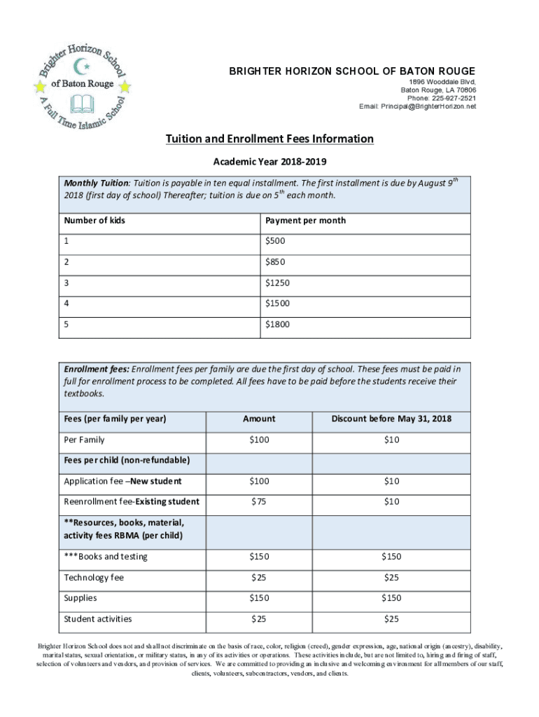 Email: Principal@BrighterHorizon.netTuition and Enrollment Fees InformationAcademic Year 20182019Monthly Tuition: Tuition is payable in ten equal installments. The first installment is due by August 9th2018 (first day of school) Thereafter; tuition is due on 5th each month.