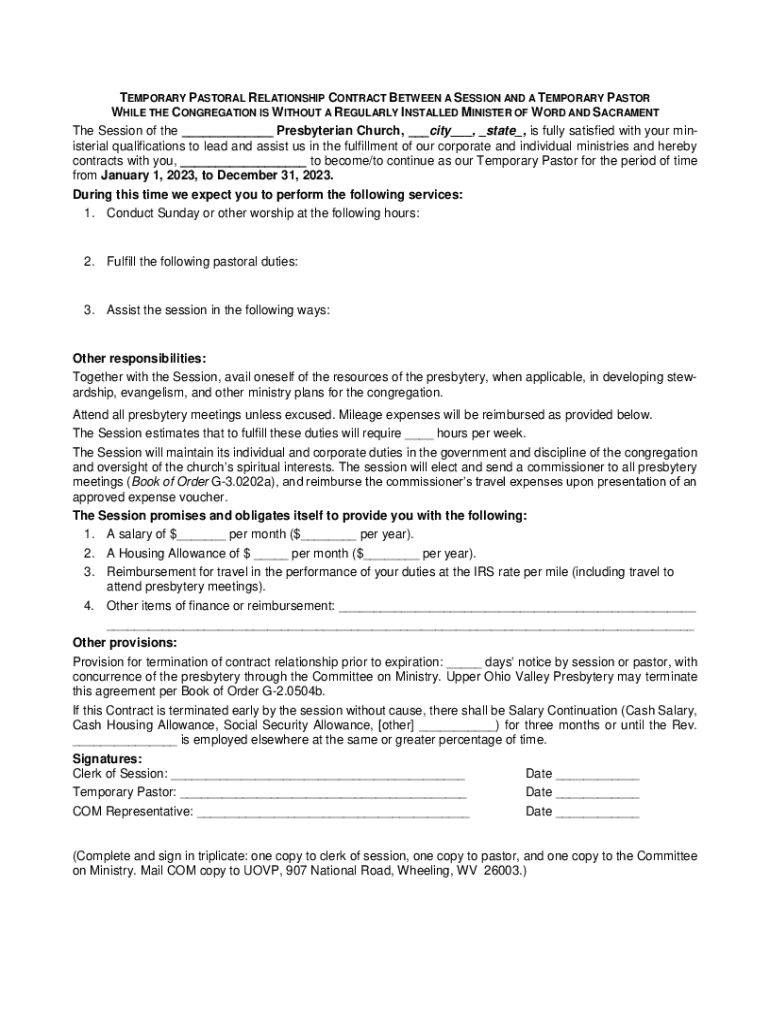 TEMPORARY PASTORAL RELATIONSHIP CONTRACT BETWEEN A SESSION AND A TEMPORARY PASTOR WHILE THE CONGREGATION IS WITHOUT A REGULARLY INSTALLED MINISTER OF WORD AND SACRAMENT The Session of the ___ Presbyterian