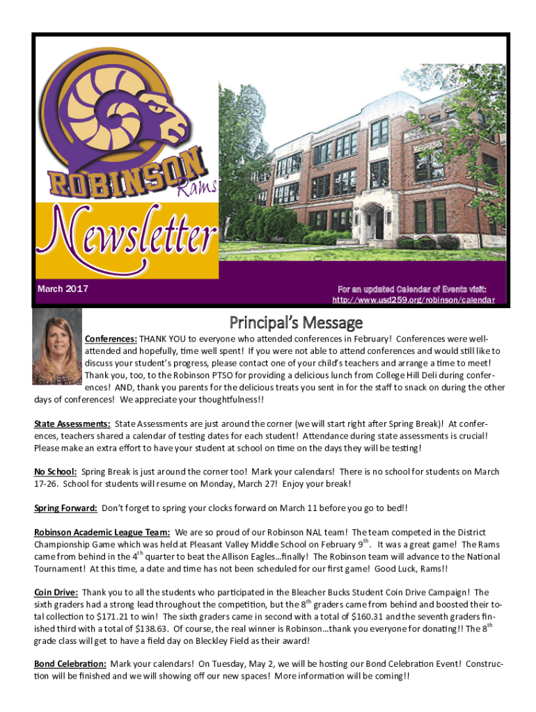 March 2017For an updated Calendar of Events visits: http://www.usd259.org/robinson/calendarPrincipals Message Conferences: THANK YOU to everyone who attended conferences in February! Conferences were