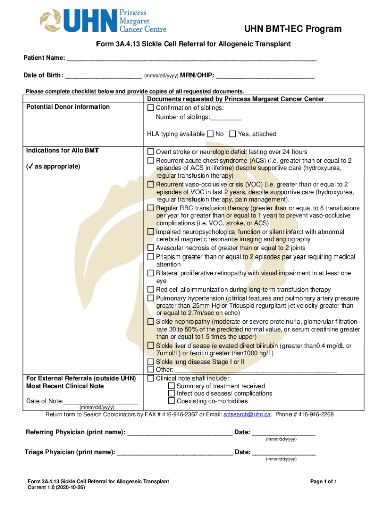 UHF BMT IEC Program Form 3A.4.13 Sickle Cell Referral for Allergenic Transplant Patient Name: ___ Date of Birth: ___ (MMM/dd/YYY) MAN/SHIP: ___ Please complete checklist below and provide copies of