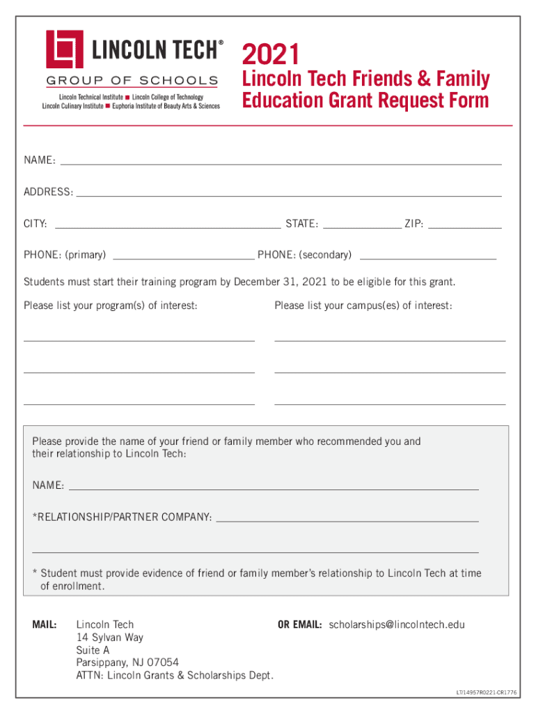 2021Lincoln Tech Friends & Family Education Grant Request Form NAME: ___ ADDRESS:___ CITY: ___ STATE:___ ZIP:___ PHONE: (primary) ___ PHONE: (secondary) ___ Students must start their training program