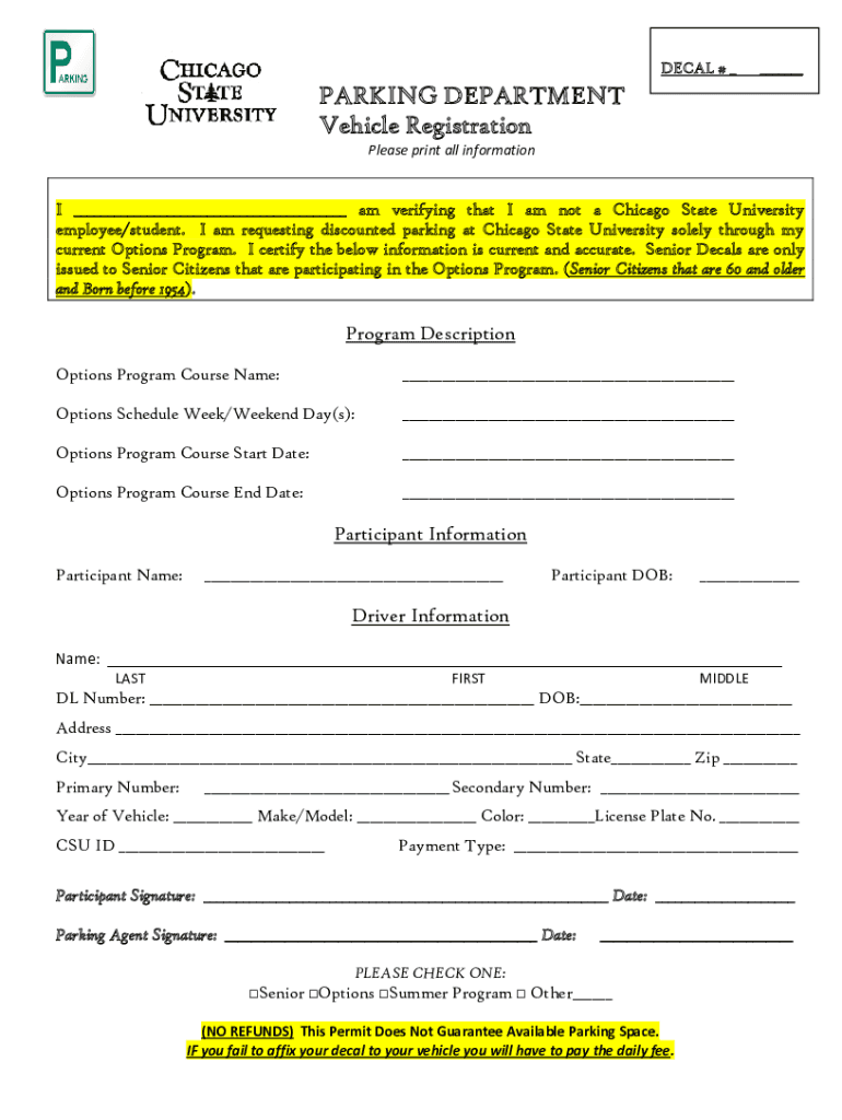 DECAL # ____PARKING DEPARTMENT Vehicle Registration Please print all information ___ am I verifying that I am not a Chicago State University employee/student. I am requesting discounted parking at