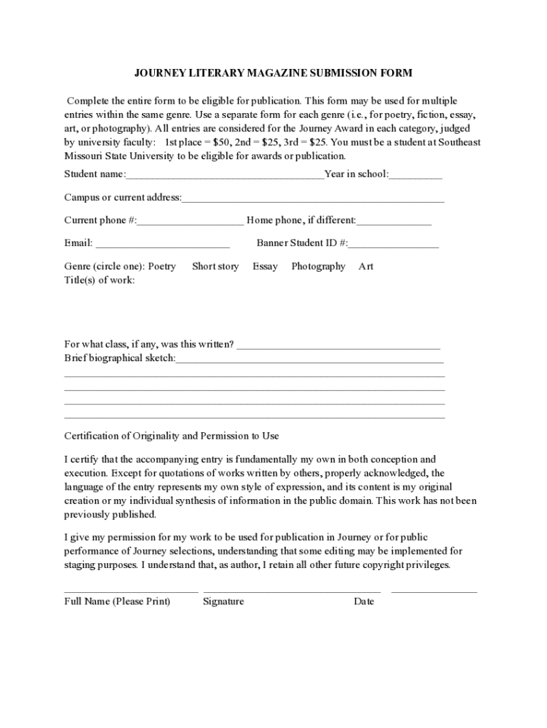 JOURNEY LITERARY MAGAZINE SUBMISSION FORM Complete the entire form to be eligible for publication. This form may be used for multiple entries within the same genre. Use a separate form for each genre