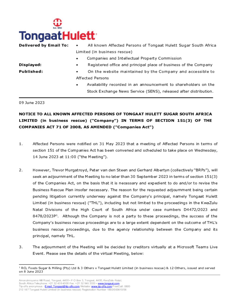 Delivered by Email To:All known Affected Persons of Tonga at Hubert Sugar South AfricaLimited (in business rescue)