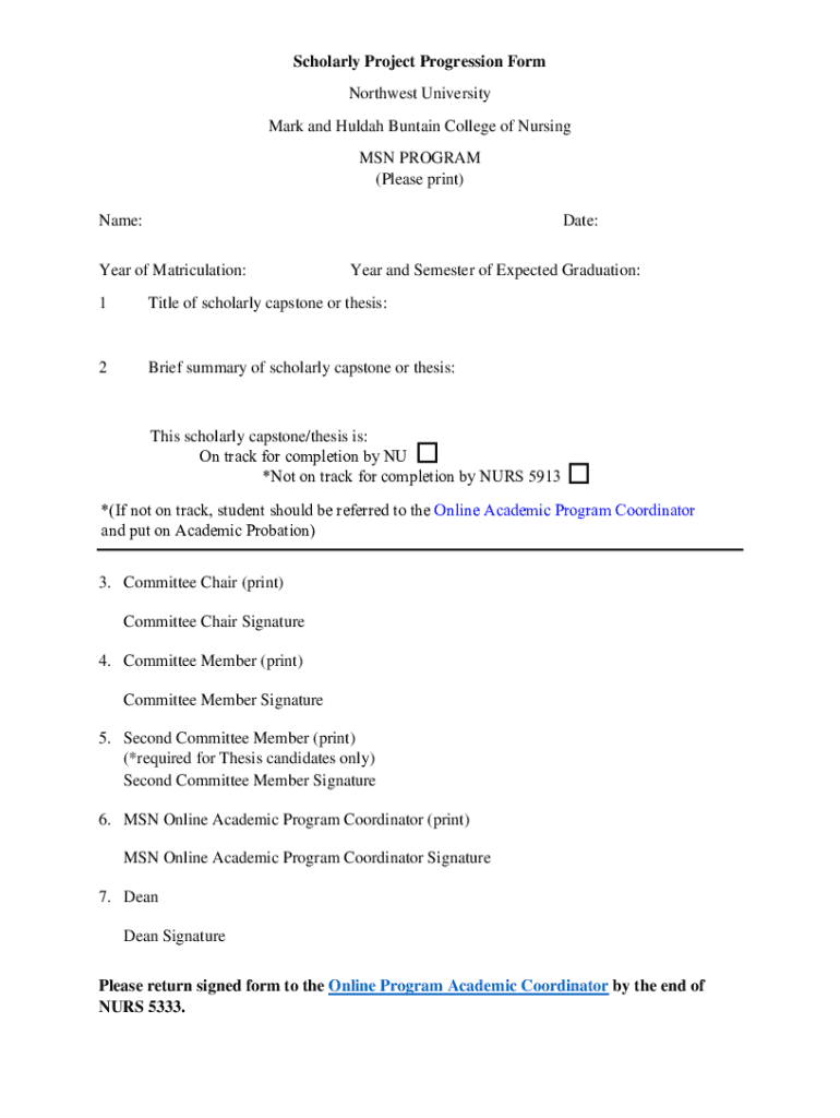 Scholarly Project Progression Form Northwest University Mark and Judah Bunt ain College of Nursing MSN PROGRAM (Please print) Name: ___ Date: ___ Year of Matriculation: ___ Year and Semester of Expected