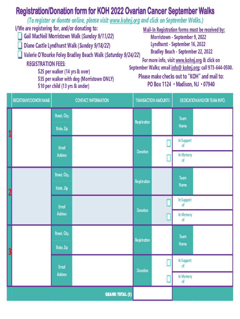 Registration/Donation form for KOH 2022 Ovarian Cancer September Walks (To register or donate online, please visit www.kohnj.org and click on September Walks.) I/We are registering for, and/or donating