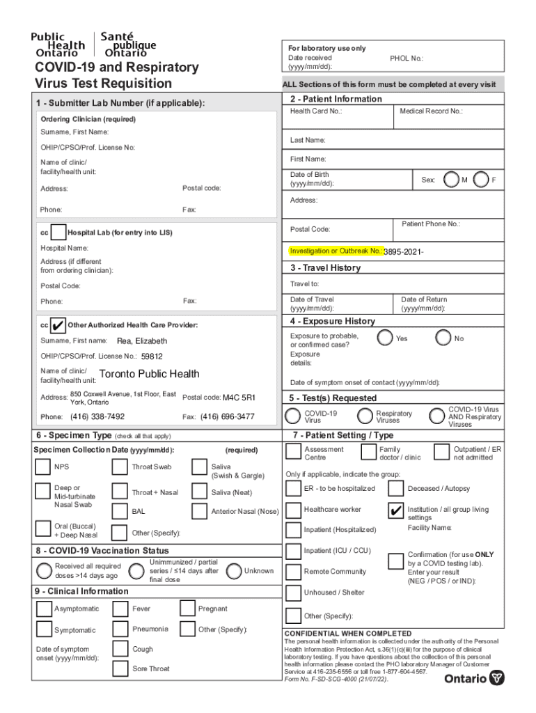 For laboratory use only Date received (YYY/mm/dd):COVID-19 and Respiratory Virus Test Requisitions ALL Sections of this form must be completed at every visit2 Patient Information1 Submitter Lab Number