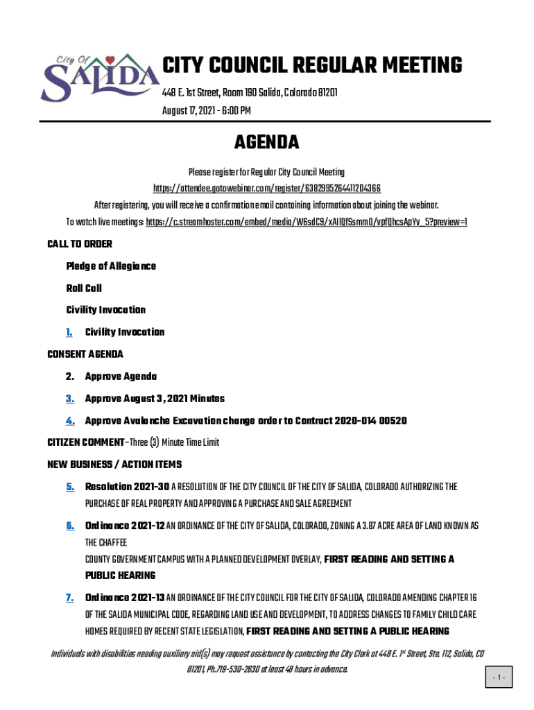 CITY COUNCIL REGULAR MEETING 448 E. 1st Street, Room 190 Saliva, Colorado 81201 August 17, 2021 6:00 AGENDA Please register for Regular City Council Meeting https://attendee.gotowebinar.com/register/6382995264411204366