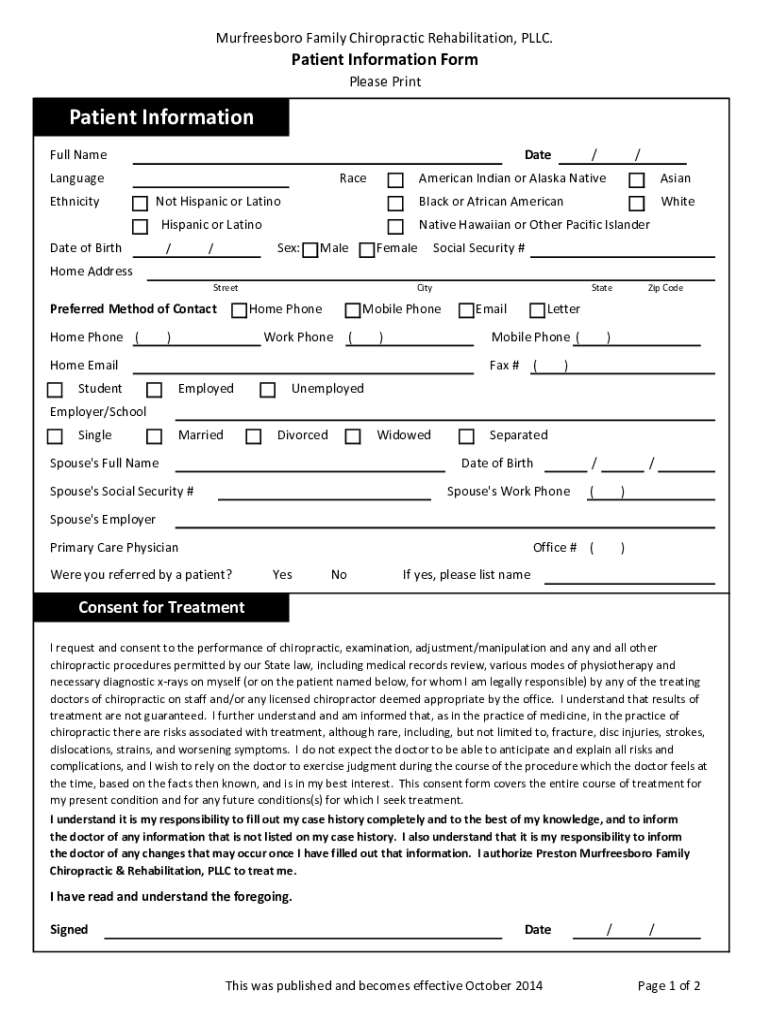 Murfreesboro Family Chiropractic Rehabilitation, LLC. Patient Information Form