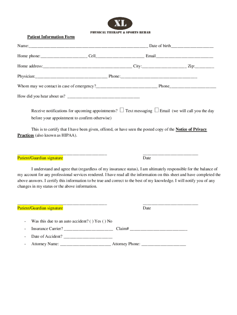 Patient Information Form Name:___ Date of birth___ Home phone:___ Cell___ Email___ Home address:___ City:___ Zip:___ Physician:___ Phone:___ Whom may we contact in case of emergency?___ Phone___ How