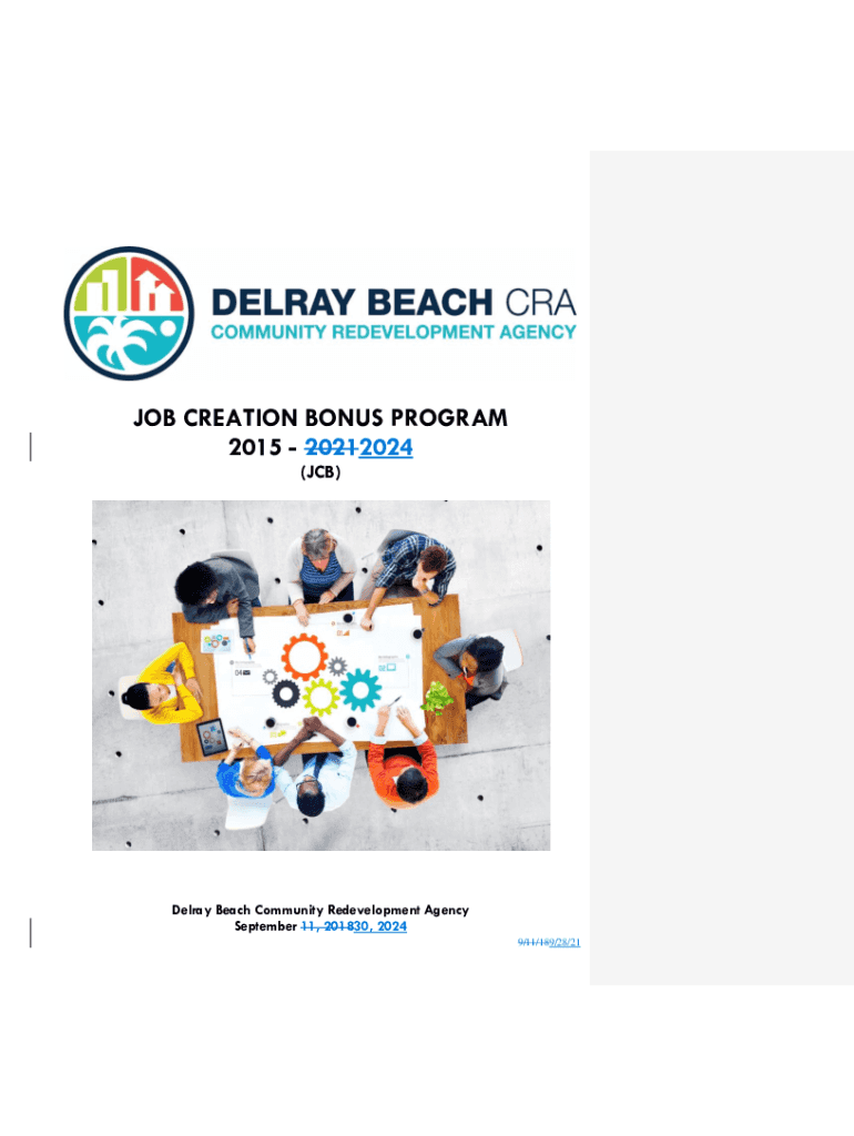 JOB CREATION BONUS PROGRAM 2015 20212024 (JCB)Delray Beach Community Redevelopment Agency September 11, 201830, 2024 9/11/189/28/21Job Creation Bonus (JCB) Incentive Program with Local Hiring Bonus