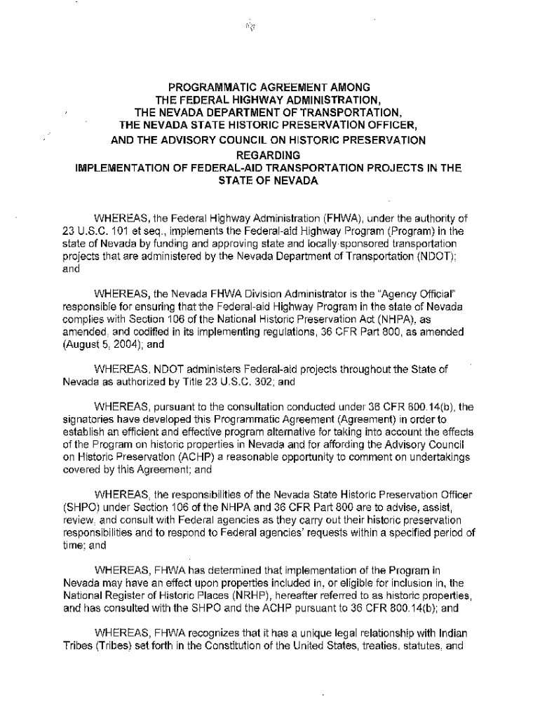 PROGRAMMATIC AGREEMENT AMONG THE FEDERAL HIGHWAY ADMINISTRATION, THE NEVADA DEPARTMENT OF TRANSPORTATION, THE NEVADA STATE HISTORIC PRESERVATION OFFICER, AND THE ADVISORY COUNCIL ON HISTORIC PRESERVATION
