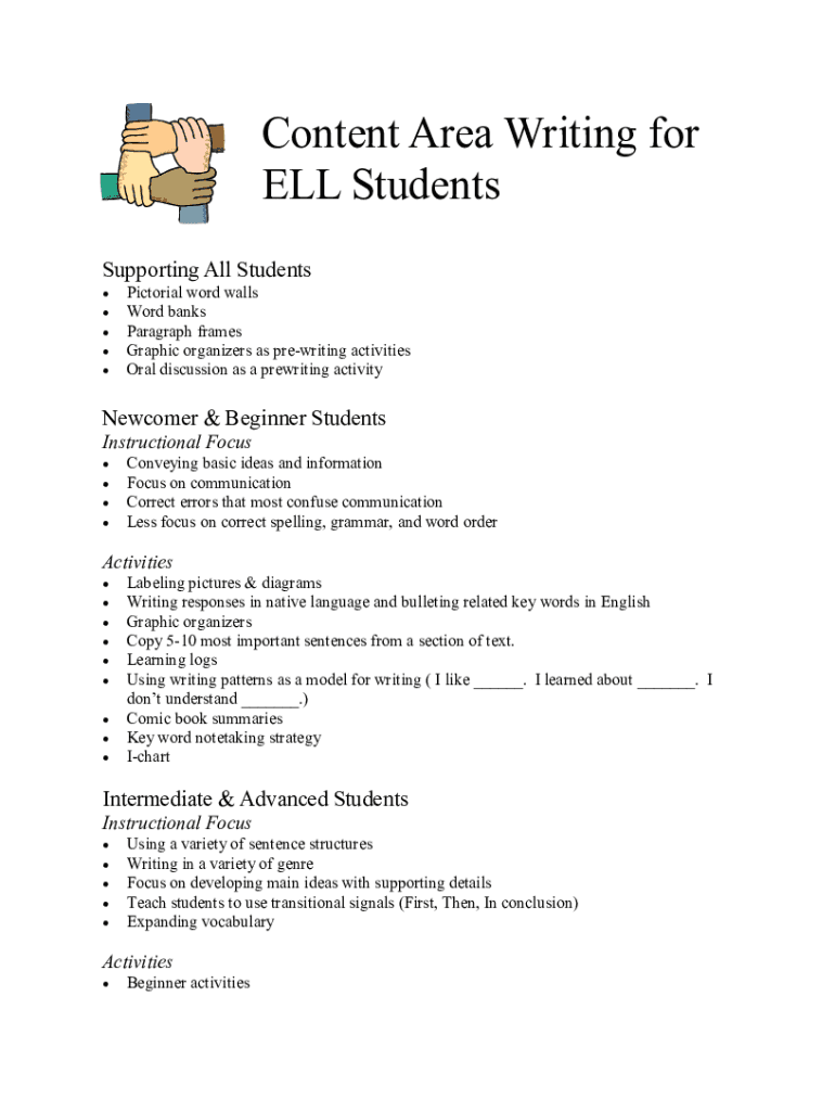 Content Area Writing for ELL Students Supporting All Students Pictorial word walls Word banks Paragraph frames Graphic organizers as prewriting activities Oral discussion as a prewriting activityNewcomer