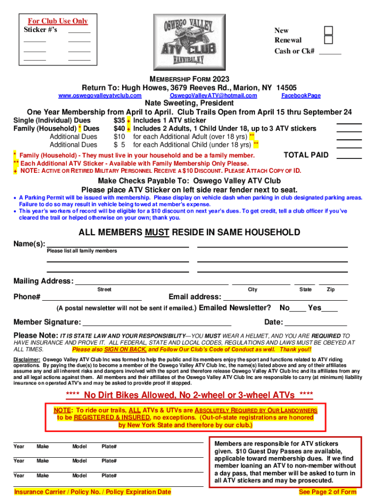 For Club Use Only Sticker #s ___ ___ ___ ___ ___ ___ ___New Renewal Cash or Ck# ___MEMBERSHIP FORM 2023 Return To: Hugh Howe's, 3679 Reeves Rd., Marion, NY 14505 www.oswegovalleyatvclub.comOswegoValleyATV@hotmail.comFacebookPageNate