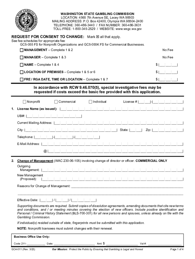 WASHINGTON STATE GAMBLING COMMISSION LOCATION: 4565 7th Avenue SE, Lacey WA 98503 MAILING ADDRESS: P.O. Box 42400, Olympia WA 985042400 TELEPHONE: 3604863440 / FAX NUMBER: 3604863631 TOLL-FREE: 18003452529