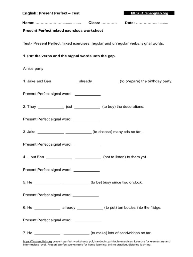 English: Present Perfect Test Name: .................https://firstenglish.orgClass: Date: ............ Present Perfect mixed exercises worksheet Test Present Perfect mixed exercises, regular and regular