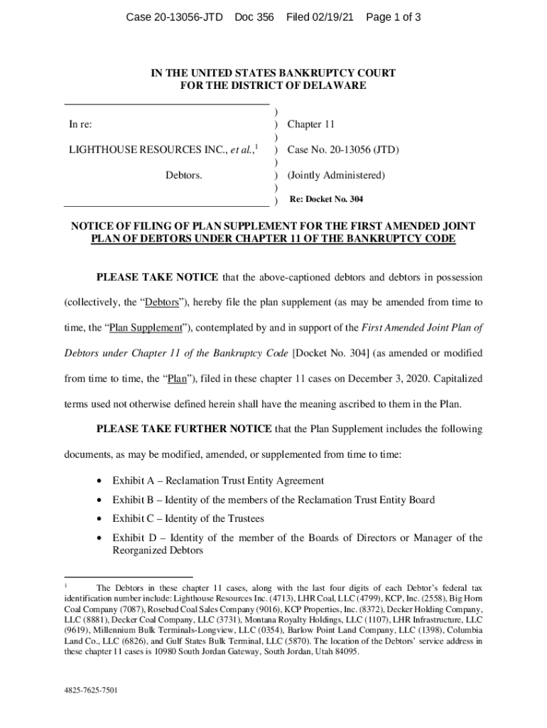 Case 2013056JTDDoc 356Filed 02/19/21Page 1 of 3IN THE UNITED STATES BANKRUPTCY COURT FOR THE DISTRICT OF Delawarean re: LIGHTHOUSE RESOURCES INC., et al.,1 Debtors.) ) Chapter 11)) Case No. 2013056