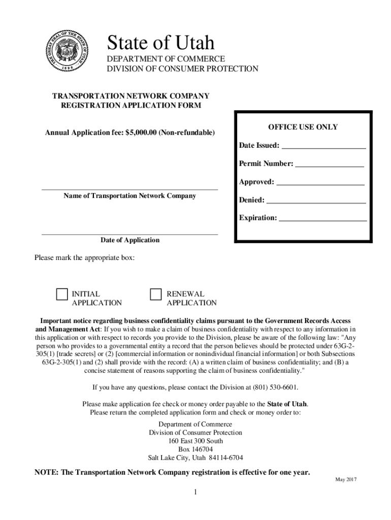 State of Utah DEPARTMENT OF COMMERCE DIVISION OF CONSUMER PROTECTION TRANSPORTATION NETWORK COMPANY REGISTRATION APPLICATION FORM OFFICE USE ONLYAnnual Application fee: $5,000.00 (Nonrefundable)Date