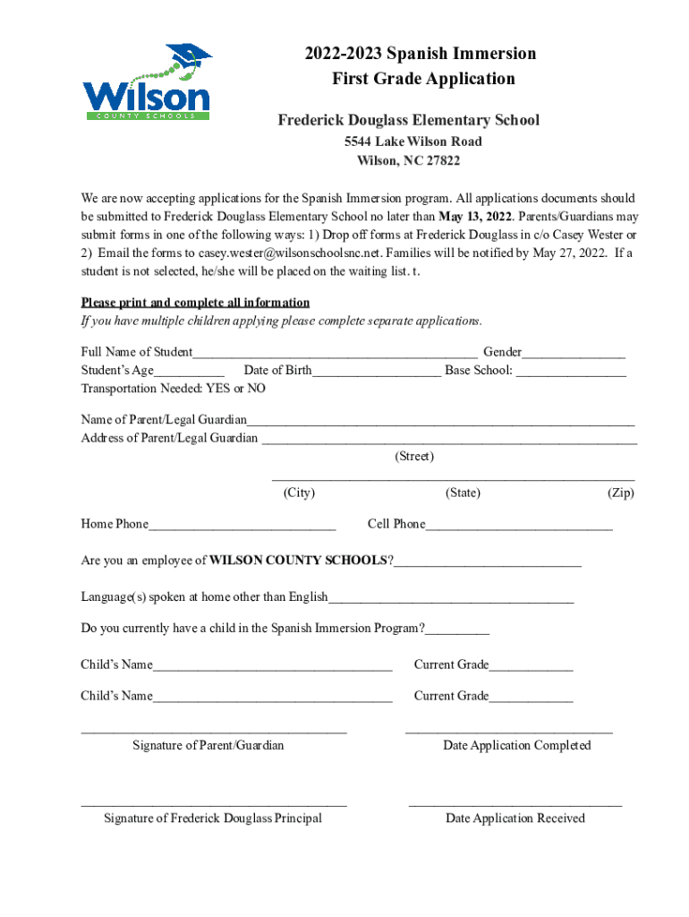 20222023 Spanish Immersion First Grade Application Frederick Douglass Elementary School 5544 Lake Wilson Road Wilson, NC 27822 We are now accepting applications for the Spanish Immersion program.