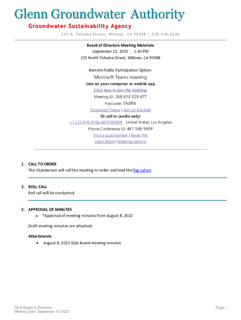 Glenn Groundwater Authority Groundwater Sustainability Agency 2 2 5 N. T e h an m an S t r e e t, W i l ow s, C A 9 5 9 8 8 5 3 0. 9 3 4. 6 5 4 0Board of Directors Meeting Materials September 13,