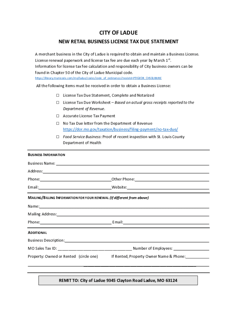 CITY OF LADLE NEW RETAIL BUSINESS LICENSE TAX DUE STATEMENT A merchant business in the City of Ladle is required to obtain and maintain a Business License. License renewal paperwork and license tax