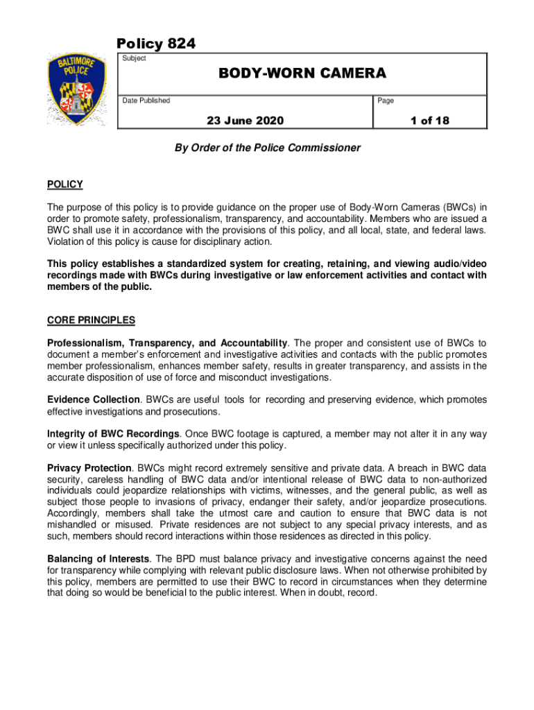 The body camera policy can be filled out by following the guidelines provided by the Baltimore Police Department.