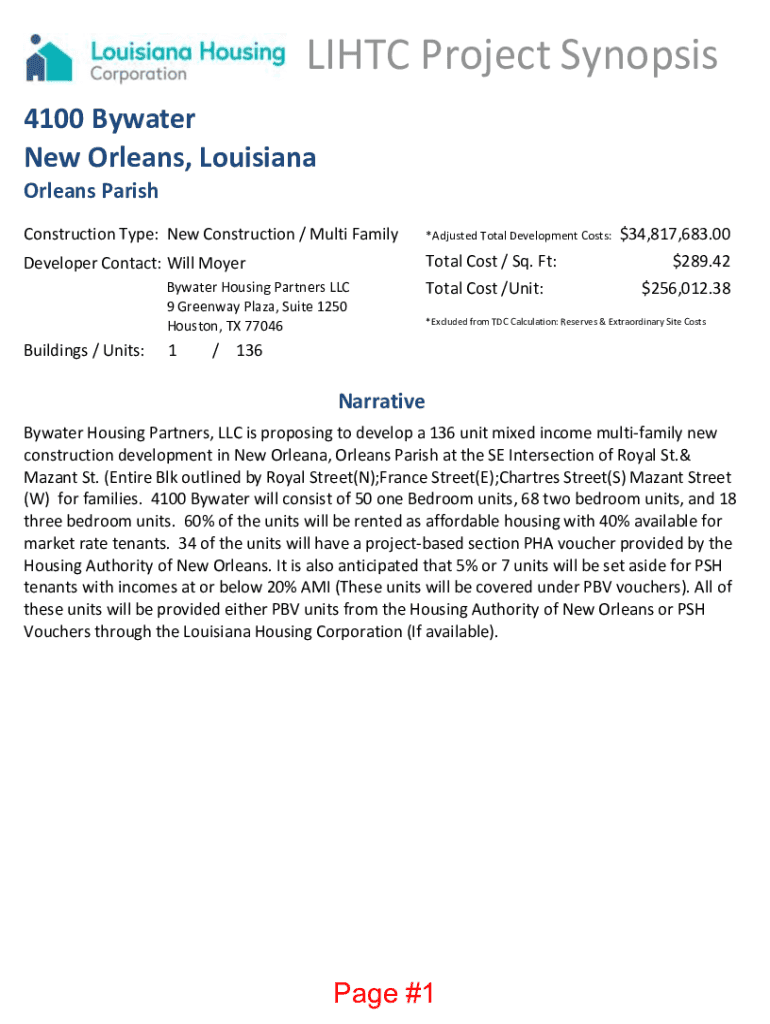 LIH TC Project Synopsis 4100 By water New Orleans, Louisiana Orleans Parish Construction Type: New Construction / Multi Family×Adjusted Total Development Costs:Developer Contact: Will MoyerTotal