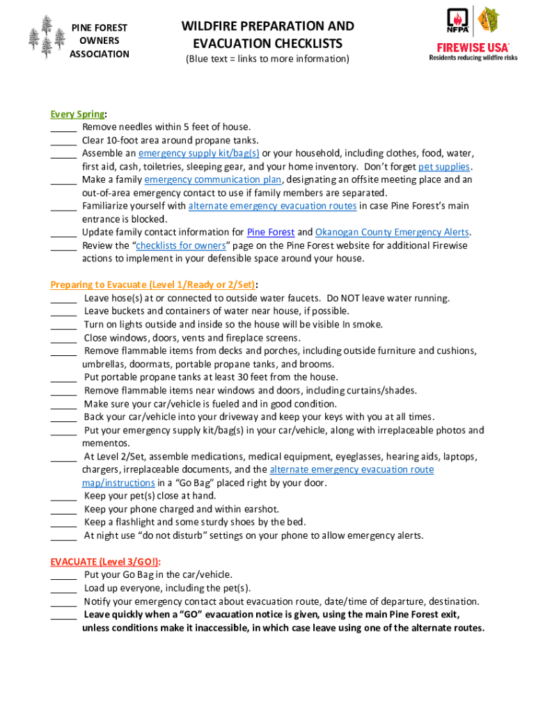 PINE FOREST OWNERS ASSOCIATIONWILDFIRE PREPARATION AND EVACUATION CHECKLISTS (Blue text links to more information)Every Spring: ___ Remove needles within 5 feet of house. ___ Clear 10foot area around