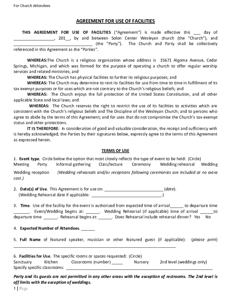 For Church AttendeesAGREEMENT FOR USE OF FACILITIES
