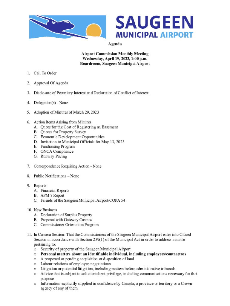 Agenda Airport Commission Monthly Meeting Wednesday, April 19, 2023, 1:00 p.m. Boardroom, Maureen Municipal Airport 1. Call To Order 2. Approval Of Agenda 3. Disclosure of Pecuniary Interest and Declaration