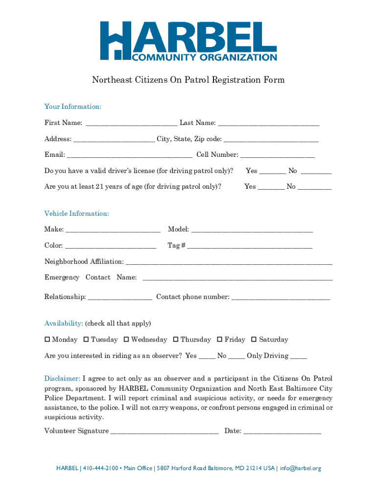 Northeast Citizens On Patrol Registration Form Your Information: First Name: ___ Last Name: ___ Address: ___ City, State, Zip code: ___ Email: ___ Cell Number: ___ Do you have a valid driver's license