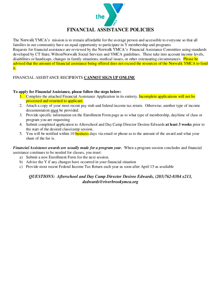 FINANCIAL ASSISTANCE POLICIES The Norwalk YMCA's mission is to remain affordable for the average person and accessible to everyone so that all families in our community have an equal opportunity to