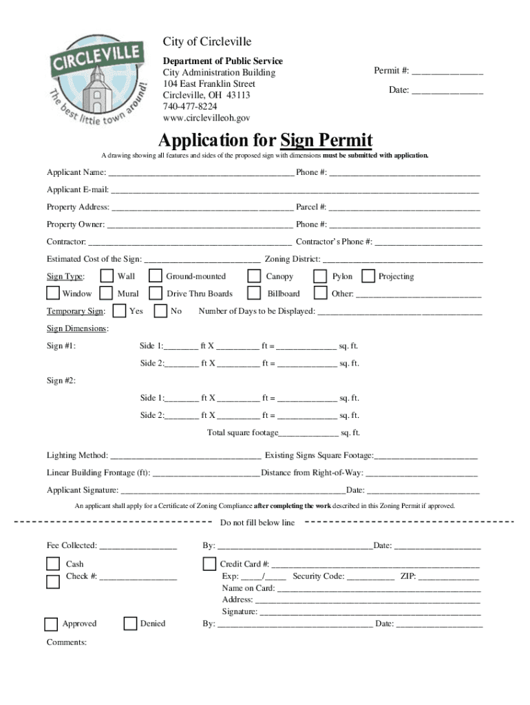 City of Niceville Department of Public Service City Administration Building 104 East Franklin Street Niceville, OH 43113 7404778224 www.circlevilleoh.govPermit #: ___ Date: ___Application for Sign