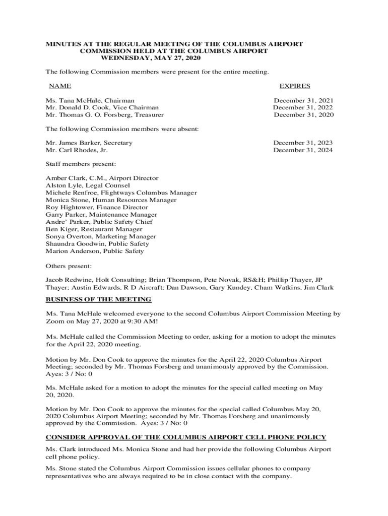 MINUTES AT THE REGULAR MEETING OF THE COLUMBUS AIRPORT COMMISSION HELD AT THE COLUMBUS AIRPORT WEDNESDAY, MAY 27, 2020, The following Commission members were present for the entire meeting. NAME Ms.
