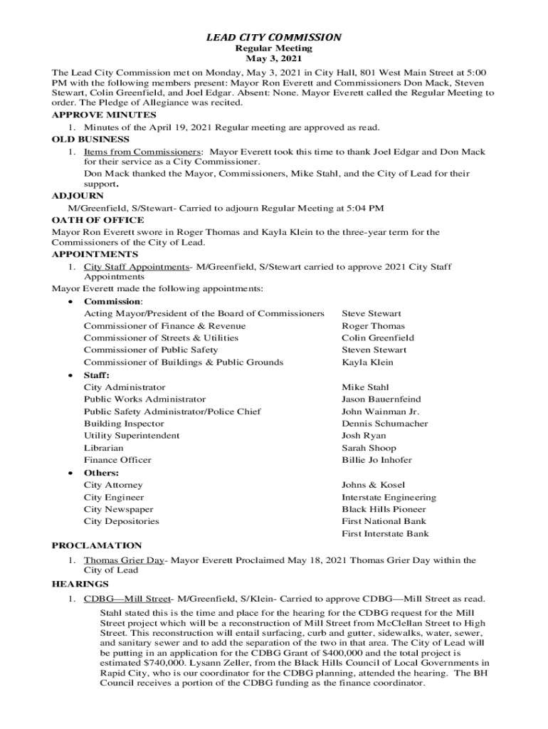 LEAD CITY COMMISSION Regular Meeting May 3, 2021, The Lead City Commission met on Monday, May 3, 2021, in City Hall, 801 West Main Street at 5:00 PM with the following members present: Mayor Ron Everett