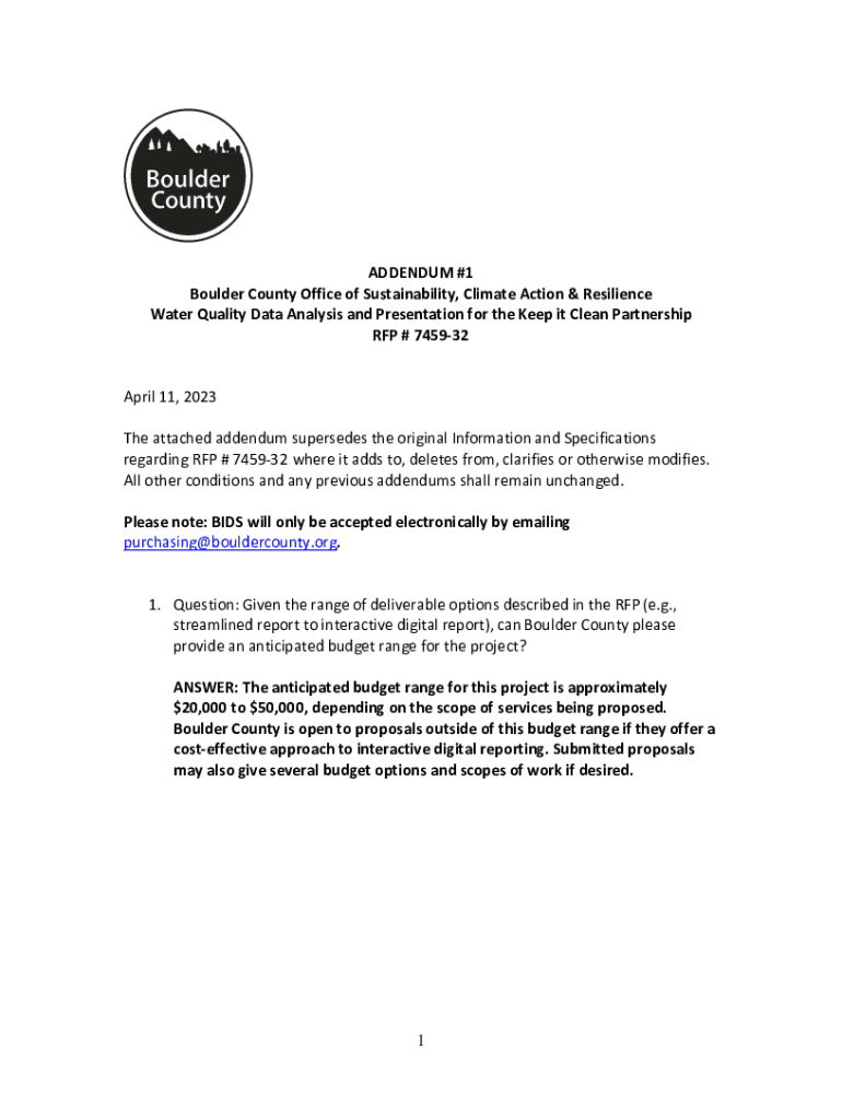 ADDENDUM #1 Boulder County Office of Sustainability, Climate Action & Resilience Water Quality Data Analysis and Presentation for the Keep it Clean Partnership RFP # 745932 April 11, 2023, The attached