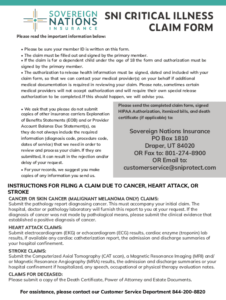 SNI CRITICAL ILLNESS CLAIM Formulas read the important information below: Please be sure your member ID is written on this form. The claim must be filled out and signed by the primary member. If the