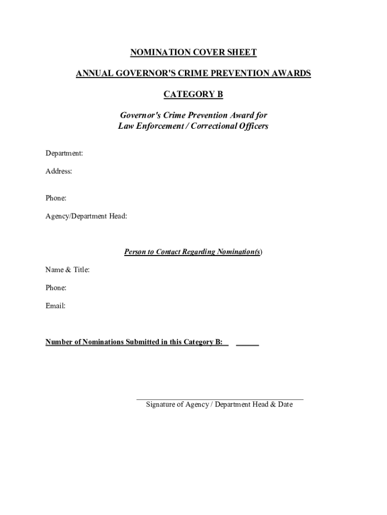 NOMINATION COVER SHEET ANNUAL GOVERNOR\'S CRIME PREVENTION AWARDS CATEGORY B Governor\'s Crime Prevention Award for Law Enforcement / Correctional Officers Department: Address: Phone: Agency/Department