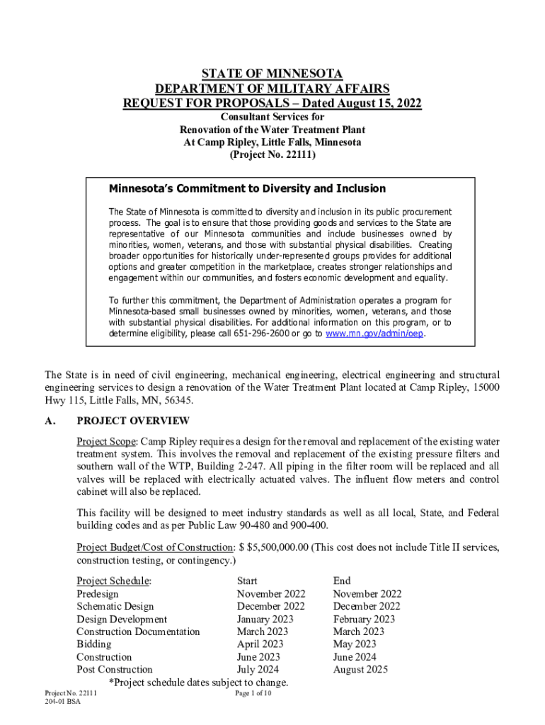 STATE OF MINNESOTA DEPARTMENT OF MILITARY AFFAIRS REQUEST FOR PROPOSALS Dated August 15, 2022, Consultant Services for Renovation of the Water Treatment Plant At Camp Ripley, Little Falls, Minnesota