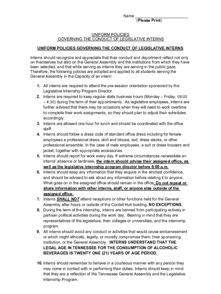 Name ___ (Please Print) UNIFORM POLICIES GOVERNING THE CONDUCT OF LEGISLATIVE INTERNS UNIFORM POLICIES GOVERNING THE CONDUCT OF LEGISLATIVE INTERNS should recognize and appreciate that their conduct
