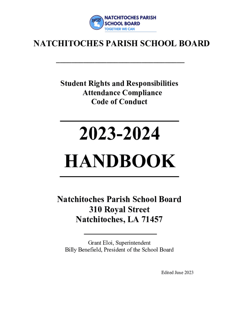 NATCHITOCHES PARISH SCHOOL BOARD ___ Student Rights and Responsibilities Attendance Compliance Code of Conduct20232024 HANDBOOK Natchitoches Parish School Board 310 Royal Street Natchitoches, LA 71457