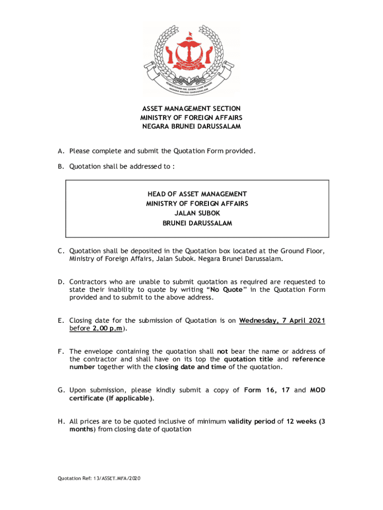 ASSET MANAGEMENT SECTION MINISTRY OF FOREIGN AFFAIRS NEAR BRUNEI DARUSSALAM A. Please complete and submit the Quotation Form provided. B. Quotation shall be addressed to :HEAD OF ASSET MANAGEMENT