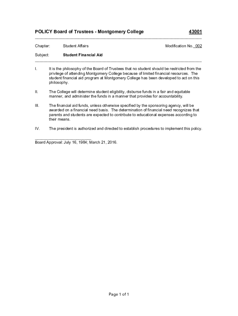 POLICY Board of Trustees Montgomery College43001___ Chapter:Student AffairsModification No. 002Subject: Student Financial Aid ___ I. It is the philosophy of the Board of Trustees that no student should
