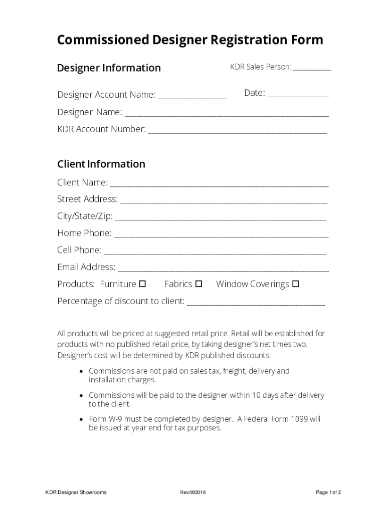Commissioned Designer Registration Form Designer Information Sales Person: ___Designer Account Name: ___Date: ___Designer Name: ___ DR Account Number: ___Client Information Client Name: ___ Street