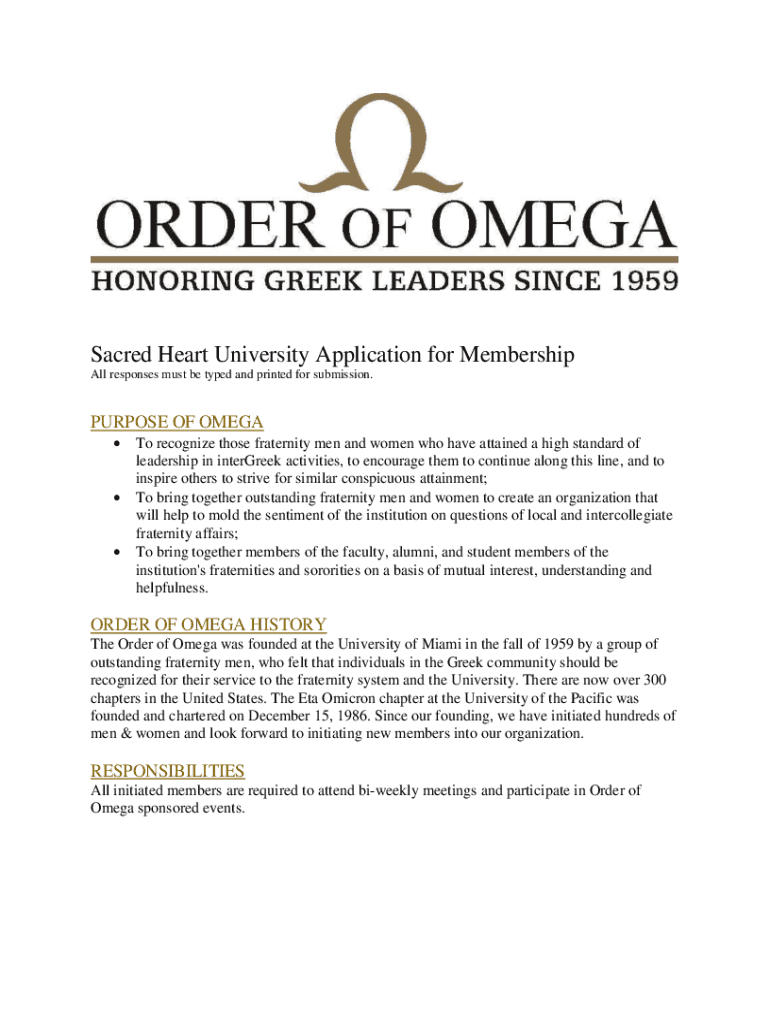 Sacred Heart University Application for Membership All responses must be typed and printed for submission. PURPOSE OF OMEGA To recognize those fraternity men and women who have attained a high standard